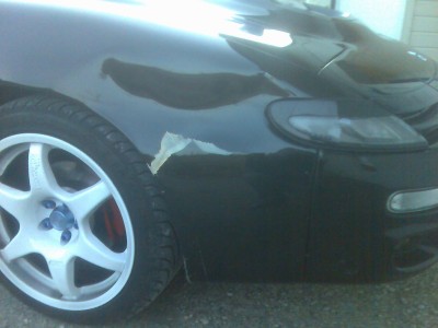 I dag har det skjedd litt med bilen. Den er levert inn for fiksing og det er SW20 som tar seg av det. Han har tatt firhjulskontroll på bilen så nå er alt bra med hjulstillinga og i dag dukket døra opp så nå får han starte på resten. Fikk et par bilder med han tidligere i dag så jeg fikk se framgangen :D