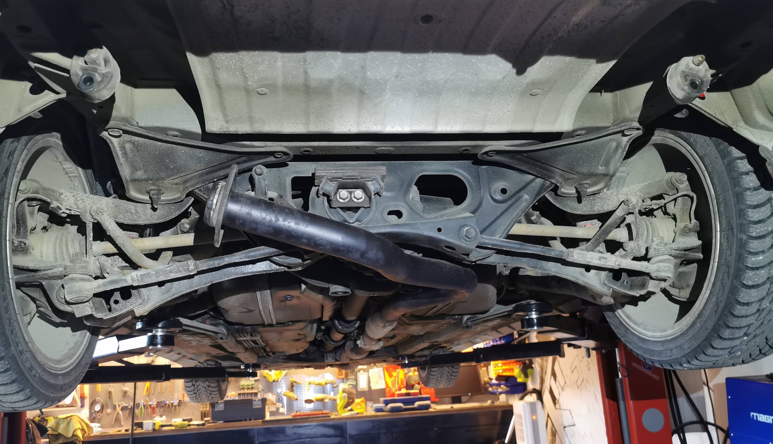 Så siden jeg ikke hadde rett verktøy tok jeg å bytta eksos når bilen først var på liften.Kurrant jobb, og perfekt passform.