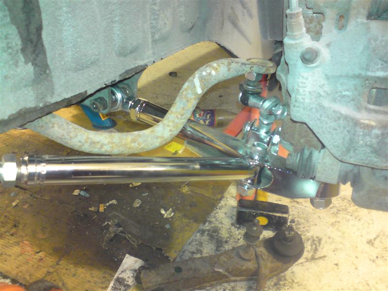 Er 4-link orginalt, men en variant med skråstilte øvre armer som tar seg av å holde ting på plass sidesveis (Satchell link variant). Denne har fordel at den er lett, samt at bakakslingen holder seg sentrert gjennom bevegelses området sitt (som watts-link, og i motsetning til panhard som flytter akslingen ut til sidene når bakstillinga fjører opp/ned). Baksiden er at om en kommer utenfor høyderegisteret det ble designet for kan en få låsing/binding i foringene som kan forårsake litt merkelige og ekle ting :lol: