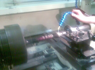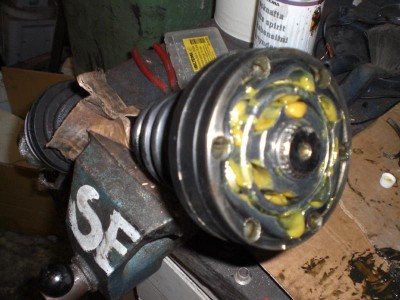 Drivaksel modifisering. Vi svidde vekk 2 dreieskjær kun på ett lite c-ring låsespor. Drivakslingene er HARDE. Hehe