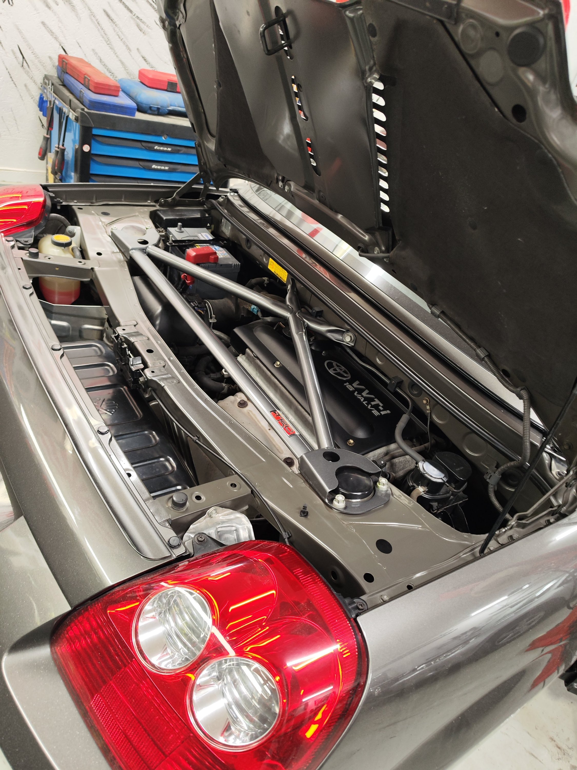 Testing av TRD tårnstag. Måtte kappe "hoopen" som er på passasjersiden, de har lagt et hull for fylling av bremseveske på JDM biler, men krasjer i viskermotor på RHD biler. TRD tårnstaget på RHD biler er bare raka rør på begge sider, så jeg må finne en rørbit på 17mm og få sveist inn der jeg kappa bort. Så blir det veldig likt et originalt TRD tårnstag for RHD.