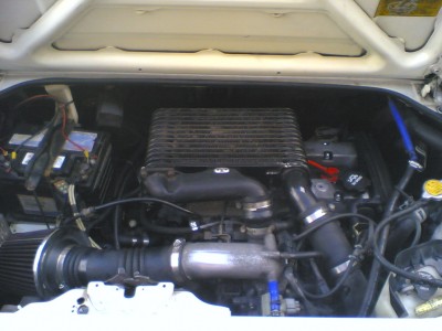 Nå står den nesten rett over motoren som dere ser på bilde, noe som ikke er helt optimalt med tanke på kjøling... Vurderer derfor å flytte Intercooleren til venstre nesten rett over batteriet får å få betre kjøling og så få fått på et SC motorlokk også...
