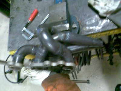 Hmm, har ikke så mange nye frekke bilder å vise om dagen.. Har hatt nede tanken å satt i walbro bensinpumpe, fått montert på fitting fra org. rør-->NPT--->6 AN på retur, men venter på rett size fittings til trykksiden fra pumpe. Men har satt opp igjen tanken likevel så tar resten fra motorrommet. Litt vaskings i motorrom, røska vekk diverse greier som evap.system og annen skabbete dødvekt. :D Vaska vekk noen kg sand & dritt og. Har fått lakka og shina opp toppdeksler og diverse, også gjenget opp toppdekslene til 1/2" NPT og satt i adapter til 10 AN på hvert toppdeksel for veivhusvent. Så nå de siste dagene har jeg kappa opp delene til ene grenrøret, har teipa det opp litt og det liner greit opp ihht 3D-modellen. Men endel jobb å kutte til 3-1 collectoren.. Måtte bruke en jig for å kutte de to snittene i 60 grader y langs 15 grader x. Etter endel klipp&fil ble det ganske greit. Må bare få punka det sammen nå og se at det passer mot motor/gir :D