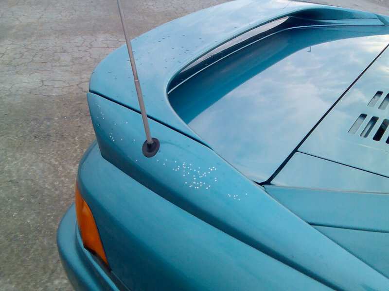 Har noen få steinsprutmerker på panser, samt de typiske boblene på vingen bak (som det ser ut som alle mr2'er har). Er også en liten skade i glassfiberen rett foran venstre bakhjul (en som var borti på en parkeringsplass, og stakk av).