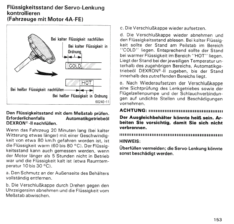 Det jeg har funnet ut er at det er lite væske i beholderen for servostyringen, det er væske der men nivået ligger under minimum, og ser ut til at det ligger delvis under der hvor jeg antar retur-slangen går (det går to slanger inn i beholder, en under og en på siden). Det får meg til å tro at det umiddelbare problemet ikke er værre enn litt luft i systemet, så kan jeg bare fylle opp tanken til korrekt nivå og så vil dette bli bedre med litt kjøring? Eller er det kompliserte utluftningsprosedyrer og tilsvarende? Nå umiddelbart vil jeg bare fikse problemet, så kan jeg heller prøve å finne ut hvor væsken har tatt veien tidligere. Det jeg vet er at det aldri har vært noe spesiellt høyt nivå i tanken så det er ingen grunn til å tro at det er noen stor lekkasje enda..