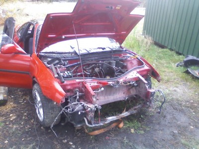 Etter å ha hatt bilen noen uker kom jeg ut for et uhell. Mener det var 30.august dette skjedde: En Suzuki Vitara kjørte foran meg og møtte på en kvist. Han stoppa helt opp, det gjorde ikke jeg :cry: Dermed ble bilen seendes ut som under. Der kan dere også se sommerfelga jeg kjøpte inn, kjøpt fra Fevik Dekk.