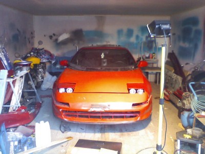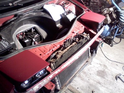 Opprettinga fortsetter... :D Kan også legge til at delebilen var mer oransje enn rød, og at det derfor er mulig å se forskjell på nye deler. Men som sagt skal fronten lakkeres ganske snart.